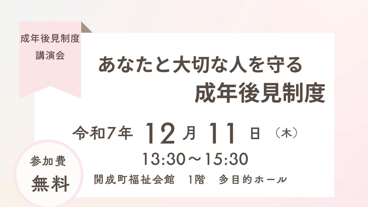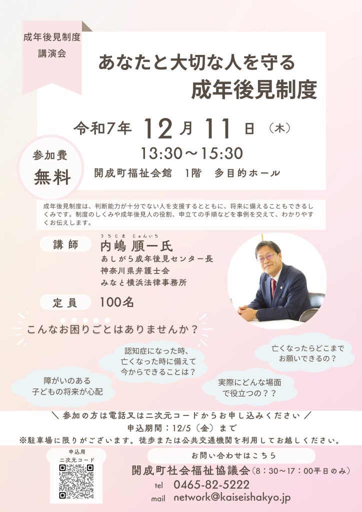 最新ニュース 成年後見制度講習会 admin 2025年11月13日 / 2025年11月14日 成年後見制度講演会 あなたと大切な人を守る成年後見制度 成年後見制度は、判断能力が十分でない人を支援するとともに、将来に備えることもできるし くみです。制度のしくみや成年後見人の役割、申立ての手順などを事例を交えて、わかりやす くお伝えします。 ■日 時:令和7年12月11日(木) 13時30分~15時30分■会 場:開成町福祉会館 1階 多目的ホール ※駐車場に限りがございます。徒歩または公共交通機関を利用してお越しください。 講師:内嶋 順一氏 あしがら成年後見センター長/神奈川県弁護士会/みなと横浜法律事務所 こんなお困りごとはありませんか? ●障がいのある子どもの将来が心配 ●認知症になった時、亡くなった時に備えて今からできることは? ●亡くなったらどこまでお願いできるの? ●実際にどんな場面で役立つの?? ■定 員:100名■参加費:無料■申込締め切り:12月5日(金)まで■申込み:電話または申込みフォームよりお願いいたします 開成町社会福祉協議会 TEL:0465-82-5222 (8:30~17:00 平日のみ) お申込はこちら PDFダウンロード